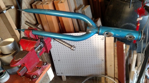 Build initially was cutting and fitting  the bike fork pieces to the tube pieces. I cut off one of the bike fork tines because it was impeding the spinning of the wheel.