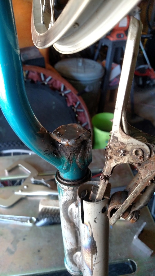 I then went with the second option of mounting to steerer tube face where the fork tine had attached. I grinded surfaces of fork /prepped for welding.