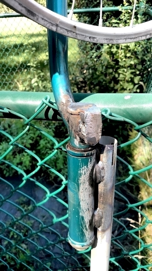 This was because the crashed wheel was very very out of tru (no longer consistently round).  Initially I thought I would just weld the steerer tube to the long section of tube but this proved impossible as it would have impeded the rotation of the fork.