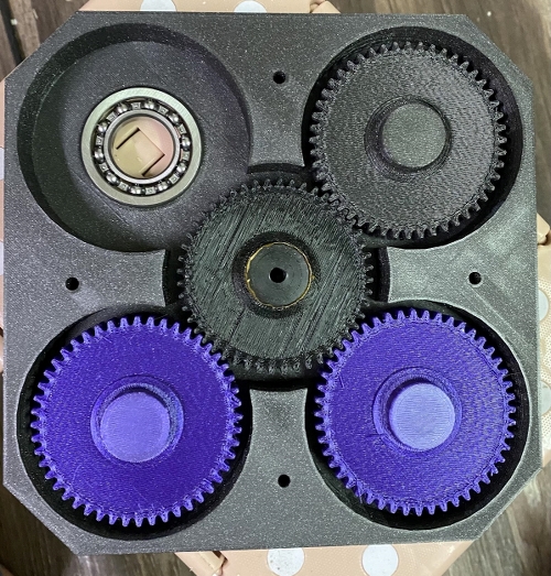 The last piece I have been sorting out is the gearbox of spinning pillars. The first couple x-carve iterations were problematic to say the latest so I adjusted it to the necessary dimensions and I was successful sizing it down to fit on the print bed of the Prusa MK3. As an additional benefit of making the box out of plastic I am now able to heat where the bearing goes into and get a perfect on the bearings that hold the gears in place.
