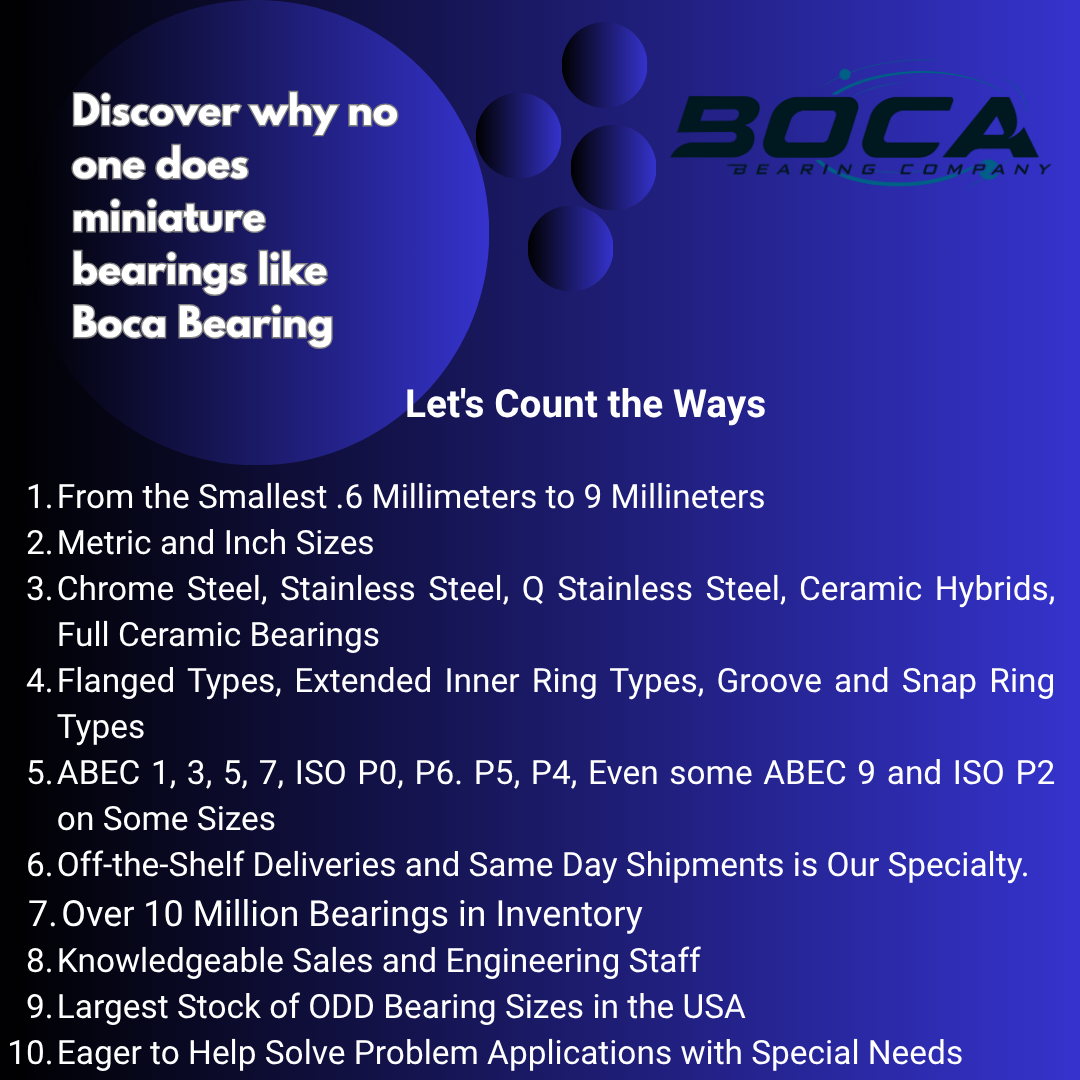 At Boca Bearing, we pride ourselves on being the go-to source for miniature bearings, unmatched in variety and service. From ultra-small .6mm to 9mm sizes, in both metric and inch standards, we offer a comprehensive range of options: chrome steel, stainless steel, Q stainless steel, ceramic hybrids, and full ceramic bearings.
